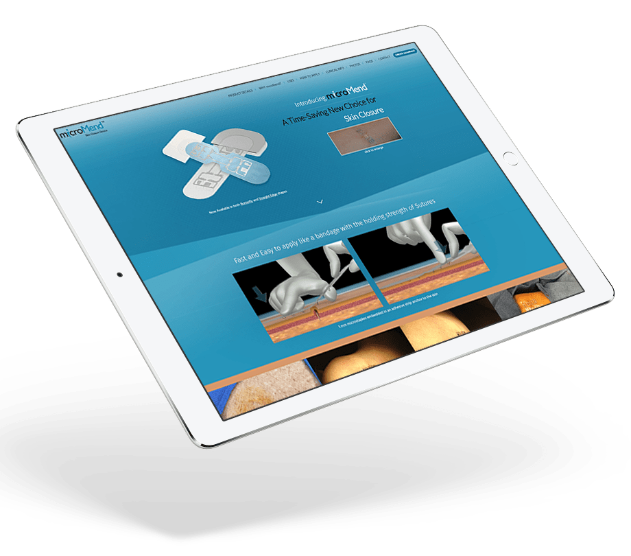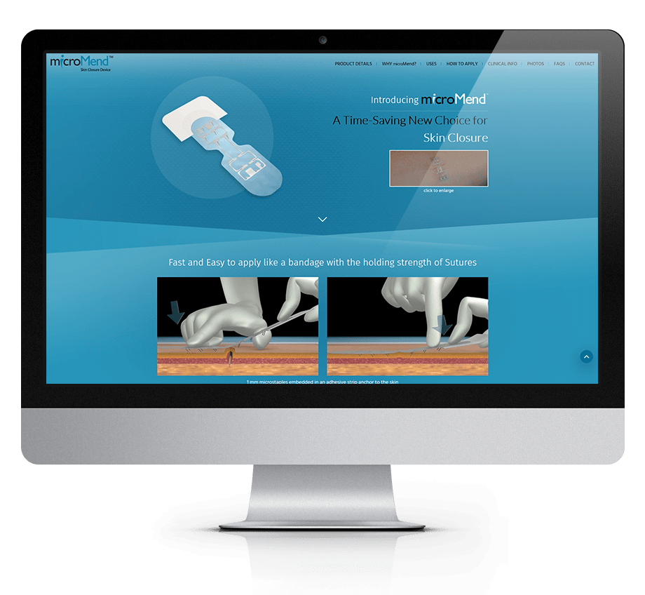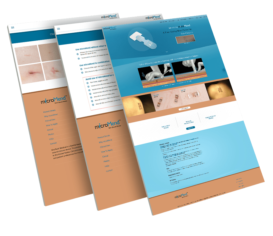 microMEND, a unique wound closure based medical product manufactured by KitoTech Medical, a Seattle based company is a FDA Class 1 medical device, which KitoTech is trying to publicize and make more popular in the medical field. Standing behind this device's track record for success in clinical studies over the traditional use of sutures, the microMEND family required a clean and legible website that will emphasize the futuristic and practical efficacy of their new product.